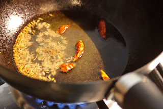 1. Olive oil in a hot pan. Cumin seeds and dry chillies in.